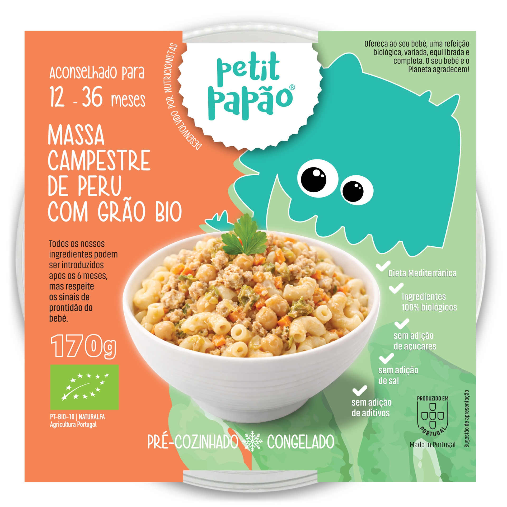 Nutrição completa e inspirada na Dieta Mediterrânica nesta refeição que combina a carne de peru, o grão-de-bico, couve e cenoura com as massinhas que os bebés tanto apreciam.