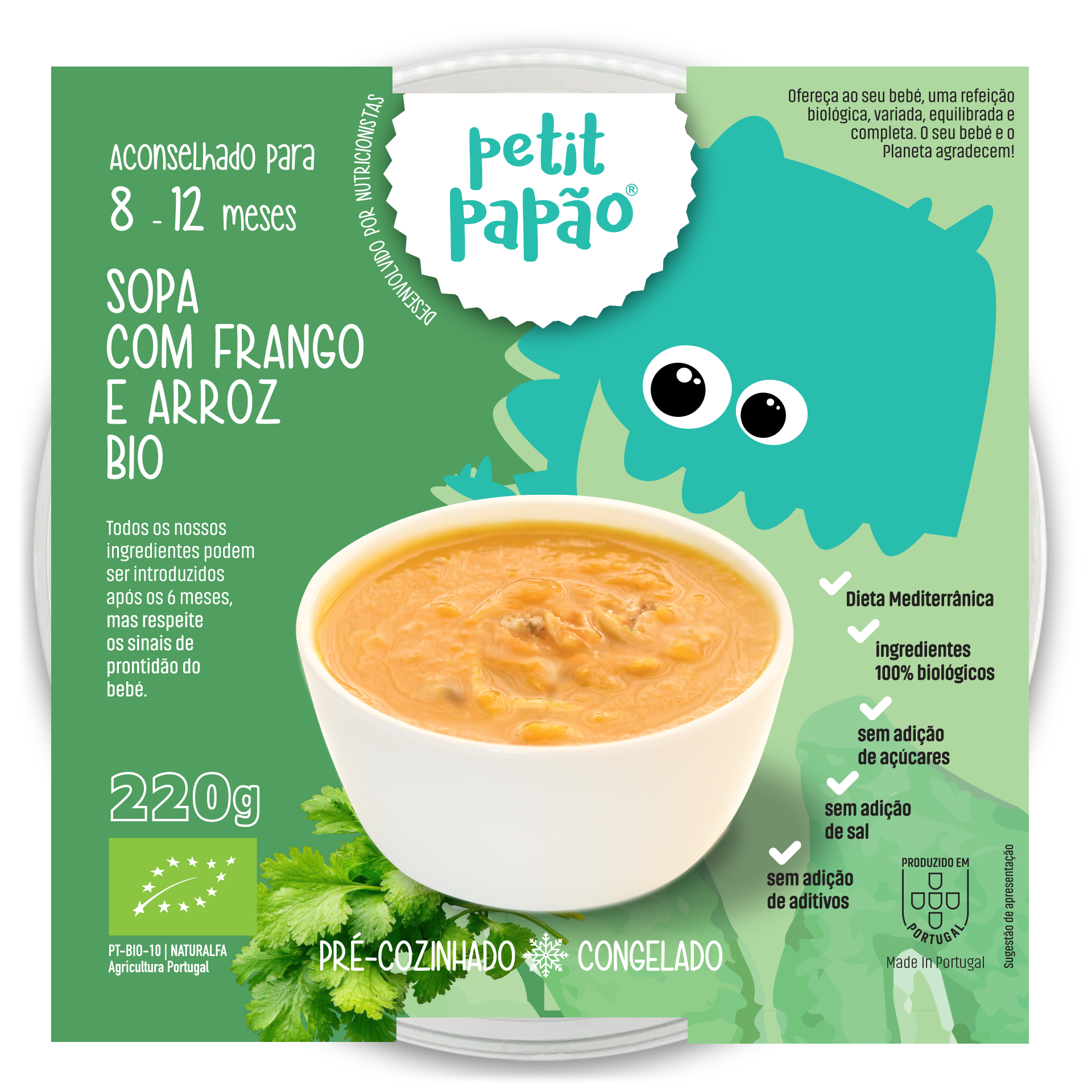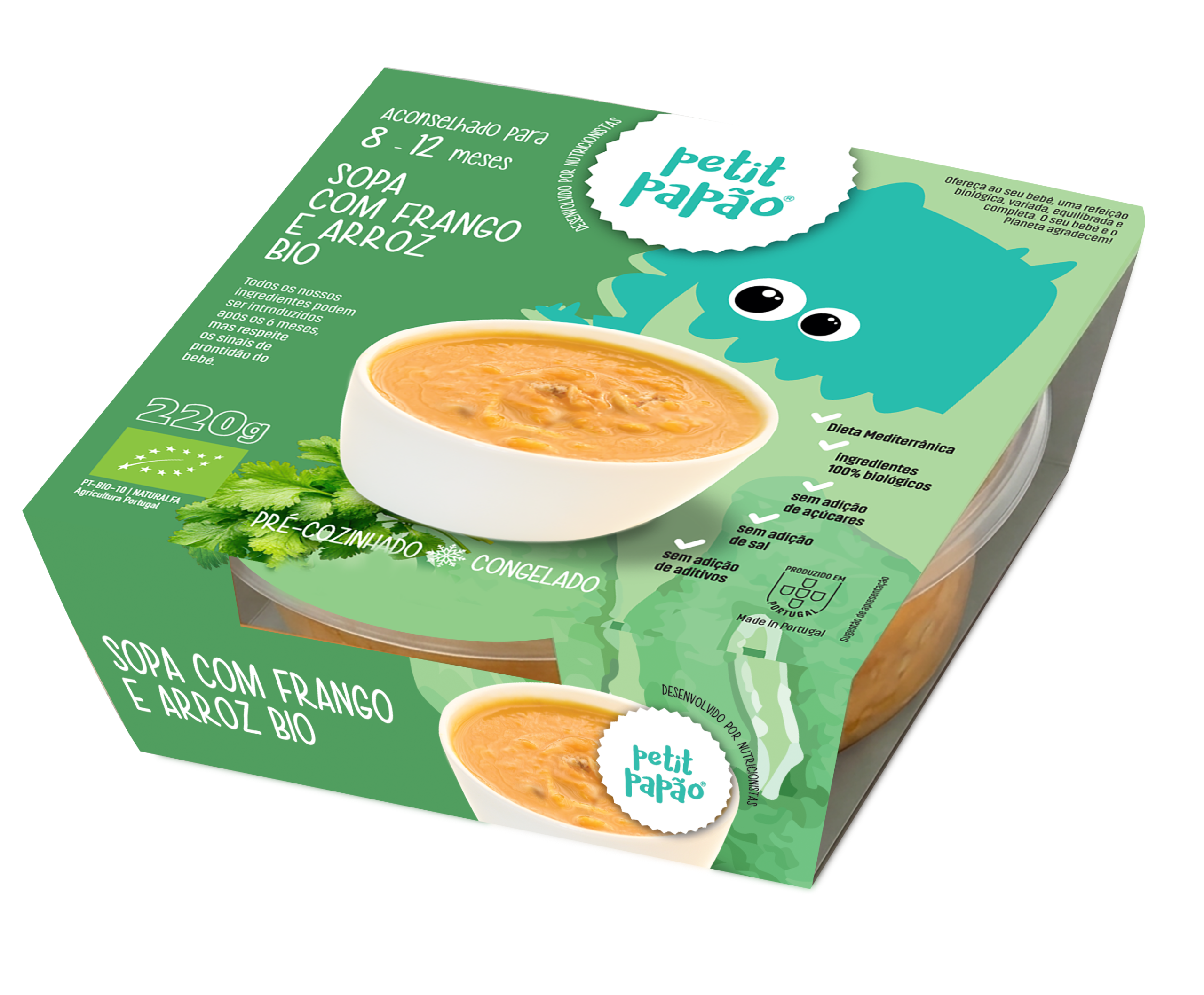 água, batata-doce, cenoura, frango (9%), batata, abóbora, alho-francês, couve-coração, cebola, azeite, arroz (1%), curgete, alho, alho em pó, salsa, ervas Provence, louro.